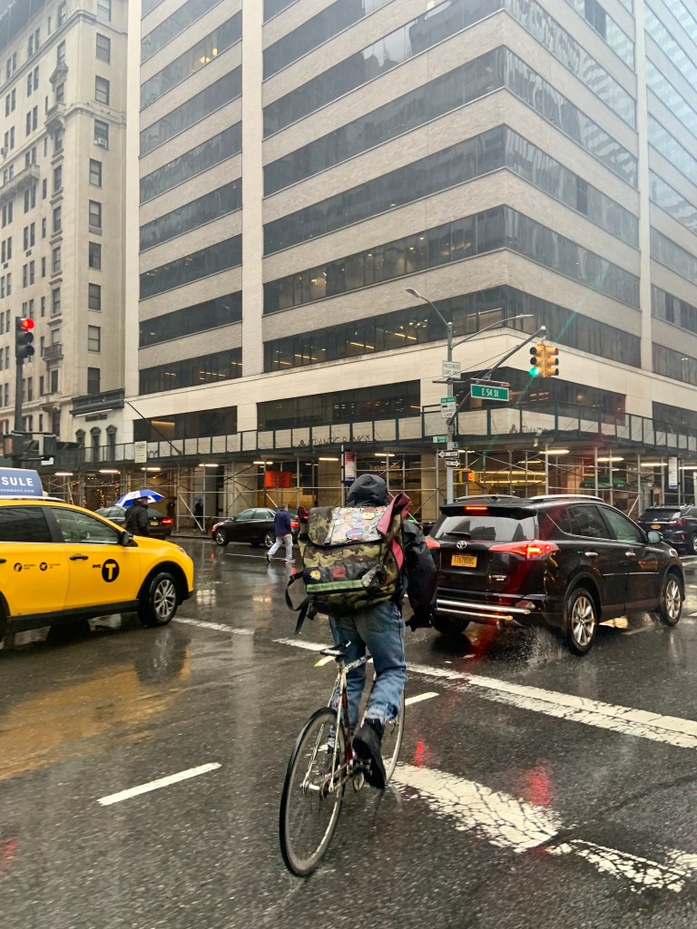 He’s against the idea of riding a cargo-bike or an electric-bike, which could potentially help him carry a heavier load or travel longer distances. He called a passing Whole Foods cargo bike a “caterpillar” and said the clunkiness would make his work more dangerous. Instead, he chooses to ride only with a waterproof black backpack strapped to his back.